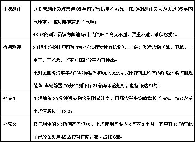 7月1日,深圳消委会委托第三方专业检测机构,对23辆符合申请测评条件的、出厂日期为2013年6月-2016年10月的国产奥迪Q5进行了车内空气质量主客观测评,结果显示:
